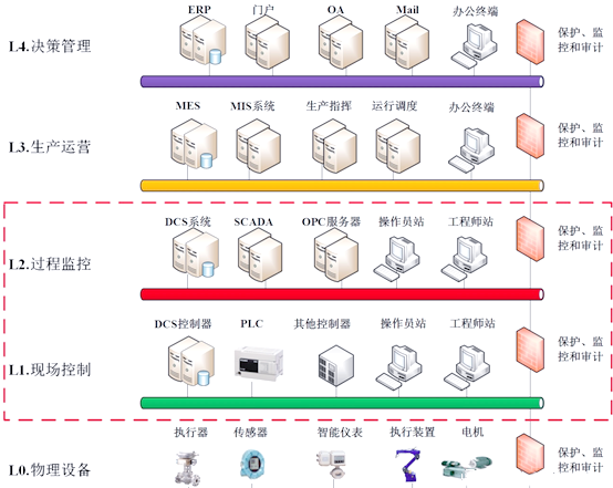 根據(jù)國際標準IEC62264-1,工業(yè)控制系統(tǒng)通常被劃分為五個層次,形成一個經(jīng)典的層級模型。這些層次按照功能從高到低進行排列,分別是:企業(yè)資源層,主要負責決策和管理;生產(chǎn)管理層,負責運營和生產(chǎn)控制;過程監(jiān)控層,對生產(chǎn)過程進行實時監(jiān)控;現(xiàn)場控制層,執(zhí)行具體的控制任務;以及現(xiàn)場設備層,即物理設備層,直接與生產(chǎn)設備進行交互。